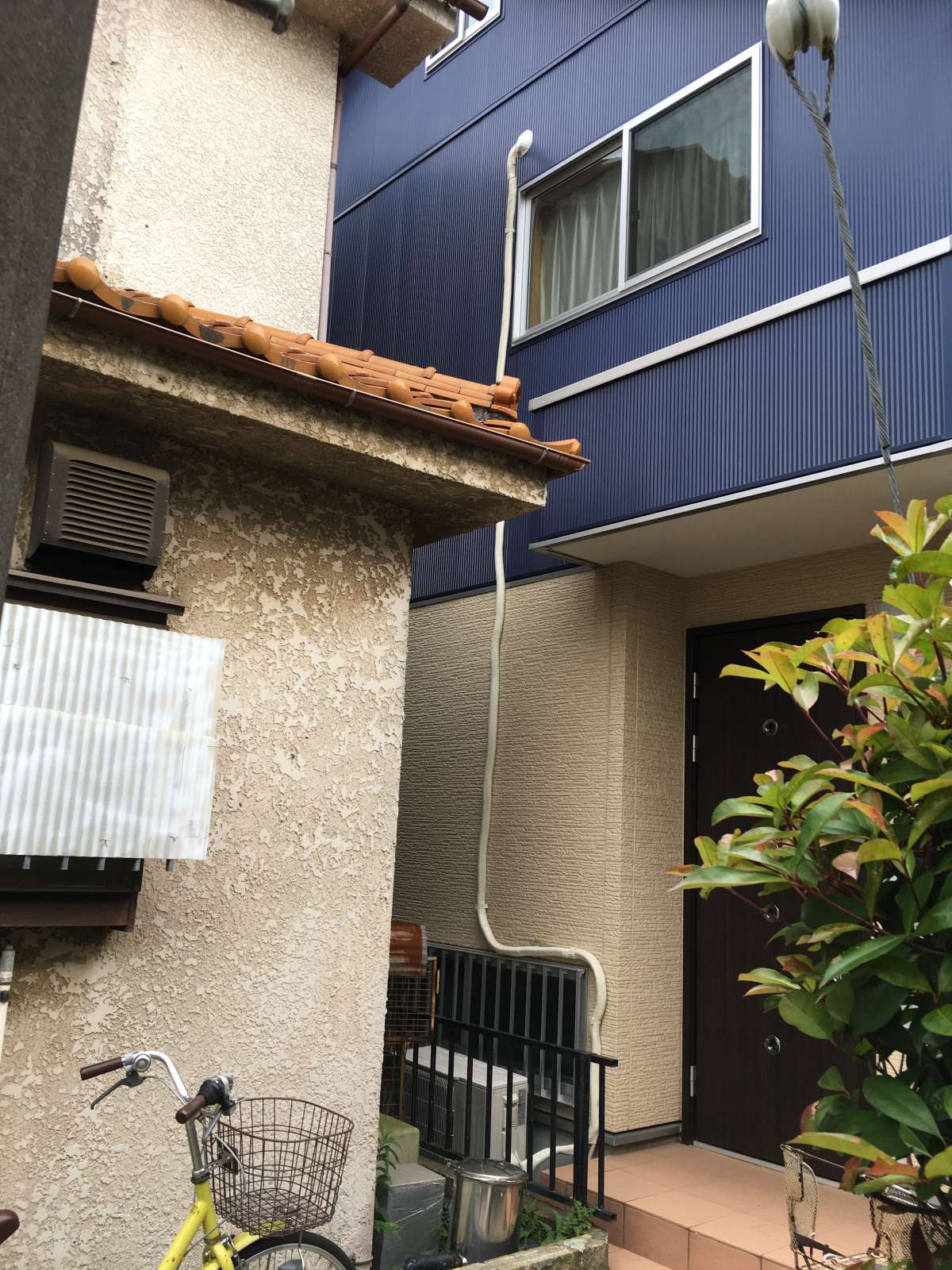 ここが難関! エアコン本体は2階 室外機は1階 ここまではよくあるケース! しかし、お隣様との間隔がとても狭い場所の設置作業です!