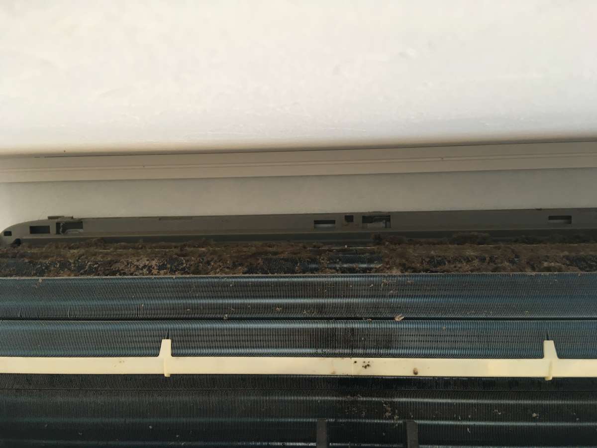【施工前】 フィルターはそこまで汚れていませんでしたが、中の熱交換器部分にほこりがびっしり・・・。 これでは、エアコン(クーラー)の風にのってカビ等のいろんな菌も一緒に送風してしまい、健康に良くないですね。 来年に備えてしっかりクリーニングします。 ※毎年5月位から、エアコンクリーニングの依頼等で大変混みあいますので余裕をもって依頼することがポイント