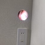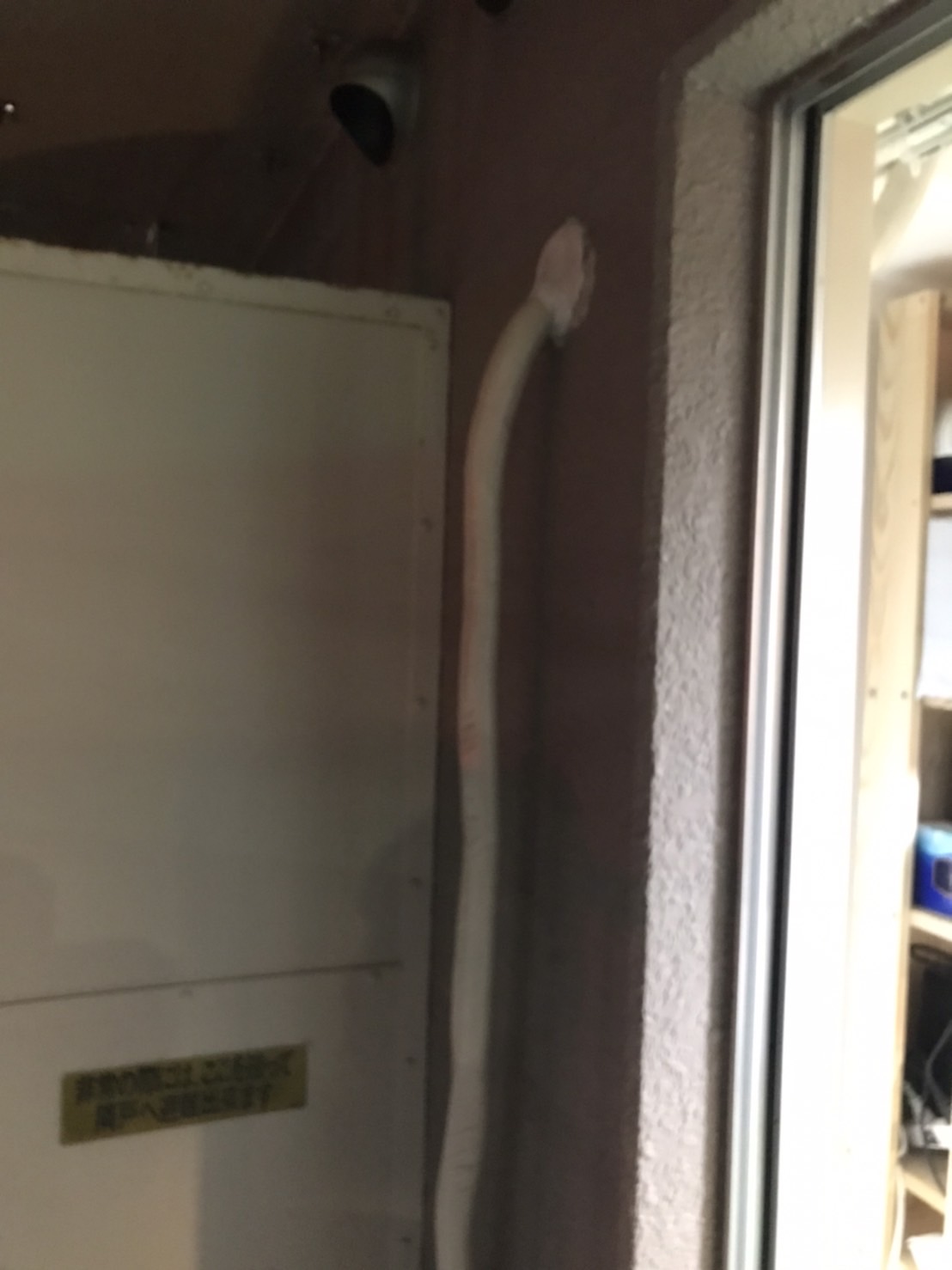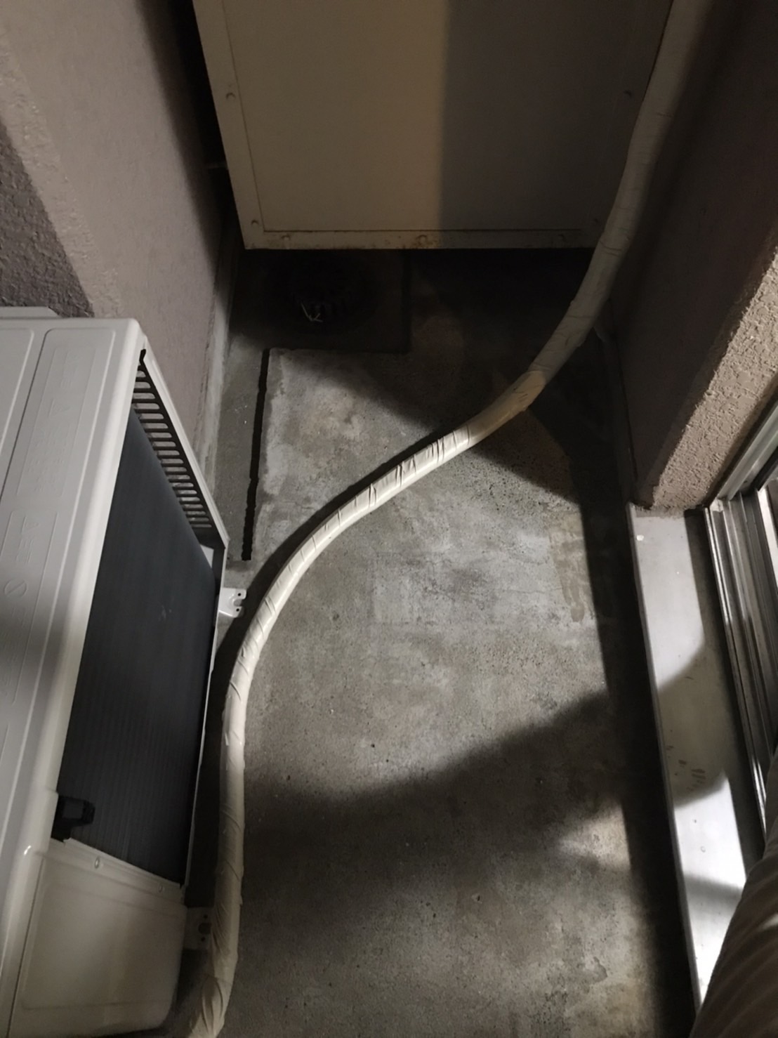 穴は専用パテでしっかり塞ぎ、エアコンホースをバルコニーへ通します。
