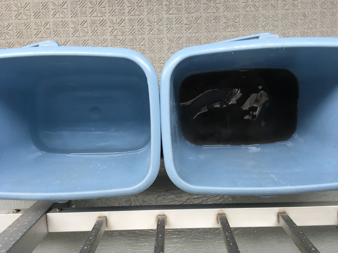 右側が、クリーニングしている最中に流れ落ちる汚れ水! あれだけ汚れていれば当然こうなります・・・。