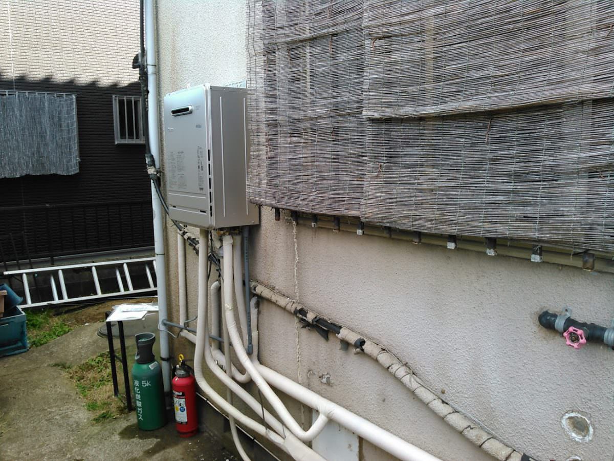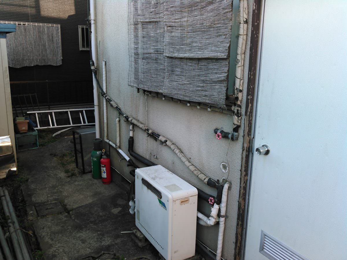 給湯器は、据置(すえおき)と言われる床に置いてある給湯器から、壁掛(かべかけ)へ交換 1本古い管がありますが、こちらは別日に撤去。