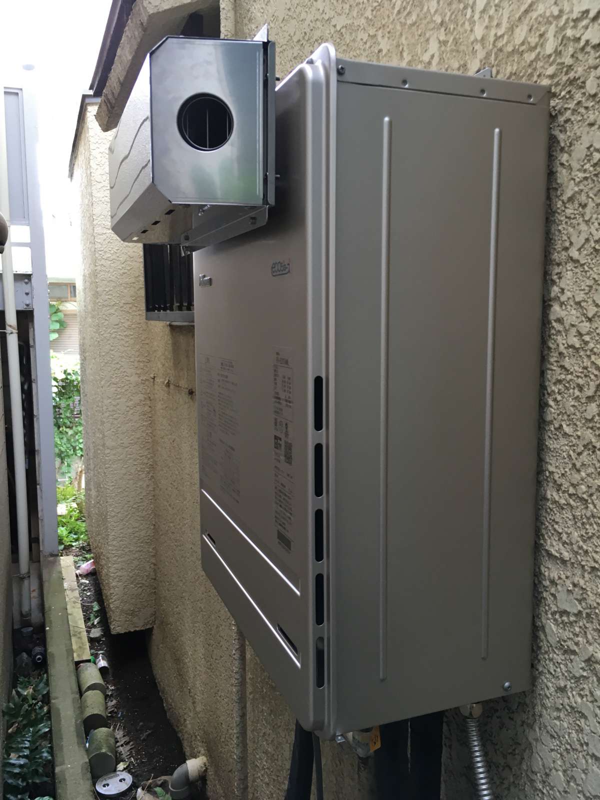 「側方排気アダプタ」を設置して、隣接する住宅に影響ないように対応して完了!