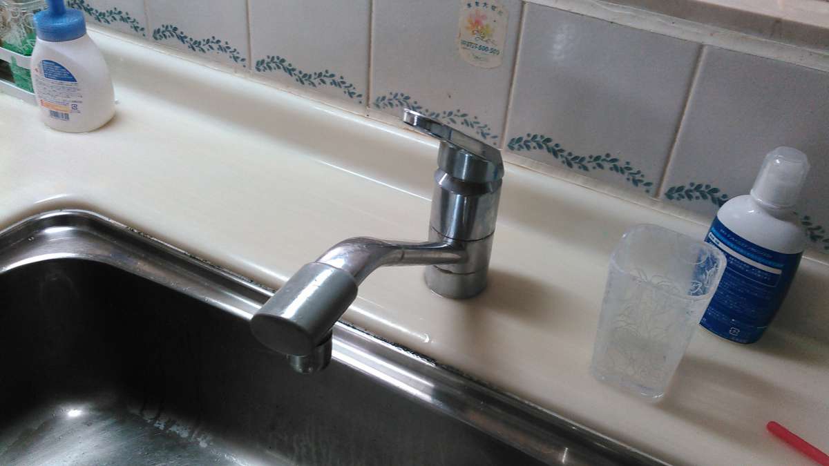 今回は、台所の水栓金具から水漏れし老朽化が激しいため、新しい水栓金具への交換事例となります。 キッチンの流し台隅々まで水が行き届き、さらにキレイな水を供給する、「浄水器、シャワーホース付き」の高機能水栓金具へと交換することになりました。 【施工前】