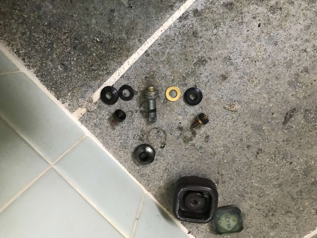 【原因究明】 分解した後の部品群です。 パッキン等の部品劣化が原因で、水漏れしていることがとても多いです。 今回も部品劣化のため、部材交換で無事水漏れが解消しました。