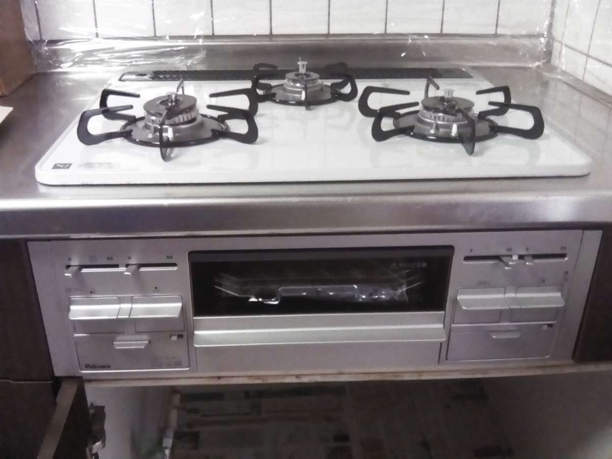 【施工後】 最新のガスコンロ設置完了です! パロマガスコンロ「S-series(Sシリーズ)」PD-600WS-60CV(ティアラシルバー) グリル部分は少し空過熱して、商品内の臭いを飛ばします。