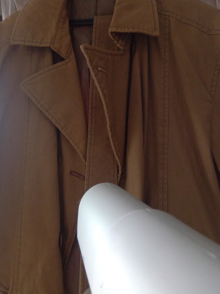 秋冬用の男性用コート(アウター)へ、光触媒のご依頼をいただきました。 ちょっと色が濃い目ですので、光触媒噴射後の跡が少し気になったのですが、裏地などで試して問題ないこと確認できましたので全体に光触媒を施工します。