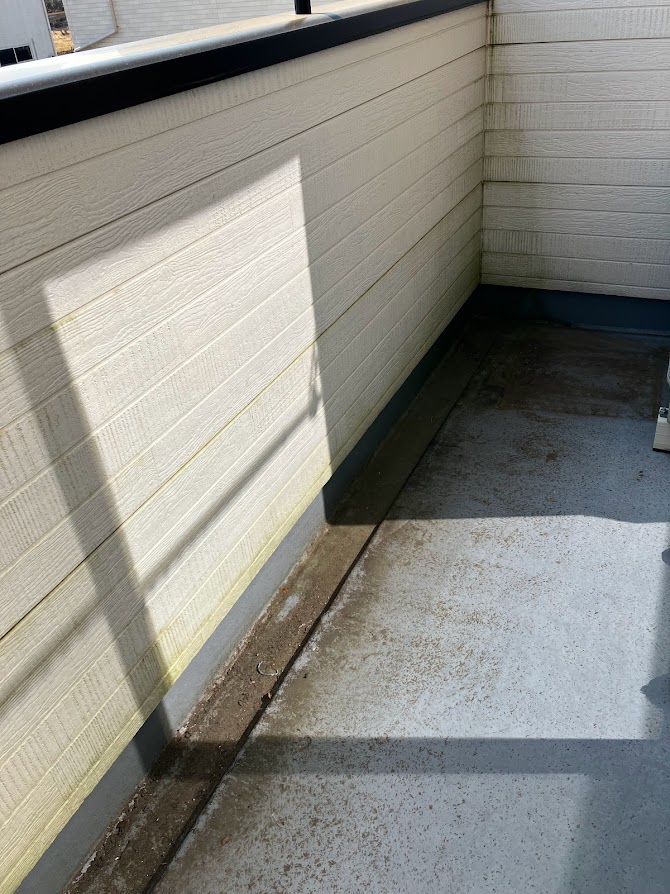 【施工前】 ベランダのいたるところに、砂埃等で汚れがこびりついてしまっていますね。 そこはプロの掃除にお任せください!