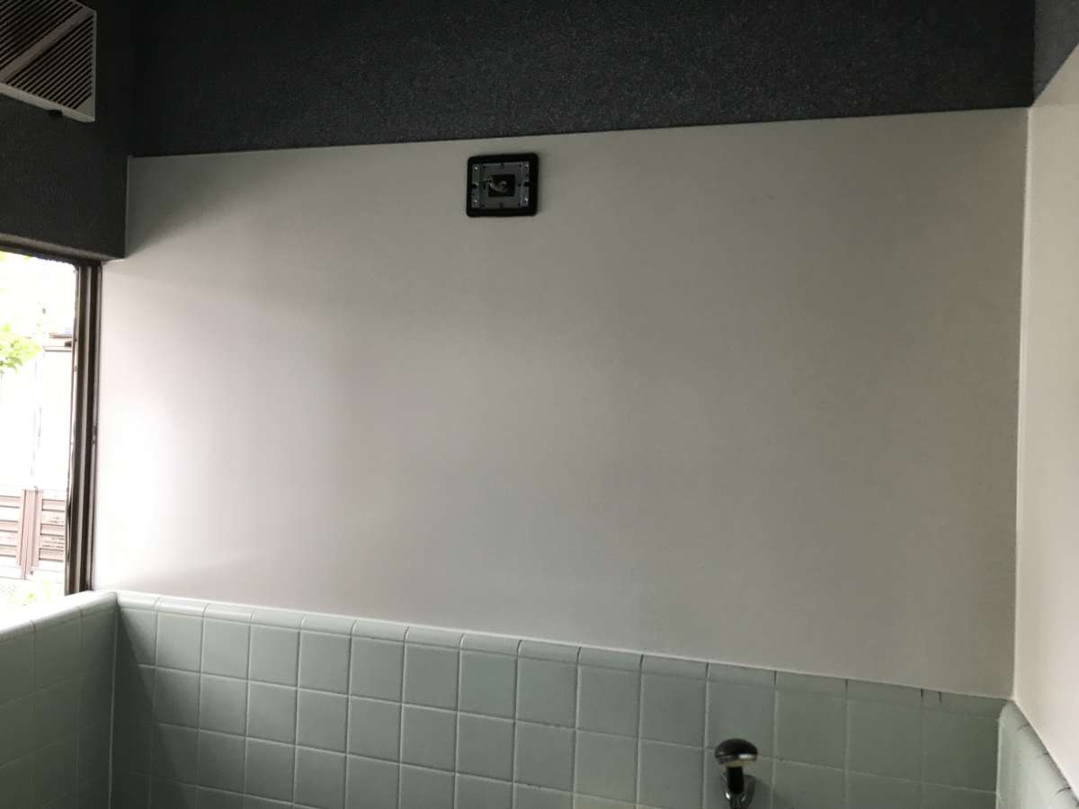 今回は、浴室の壁に穴があいているため、全面的に修理します。 デザインに併せて天井も実施します。 それでは早速見てみましょう。 【施工前】 壁に穴が所々あいており黒ずんでいます。