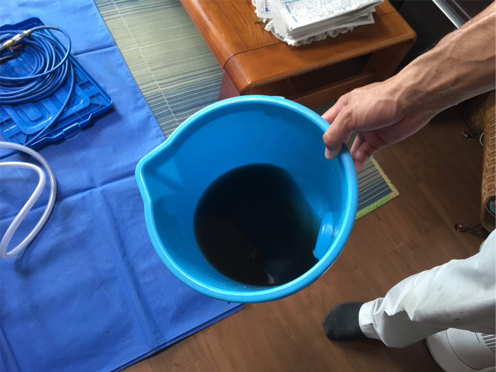 高圧洗浄すると、こんなに真っ黒な水となって汚れが落ちてきます。