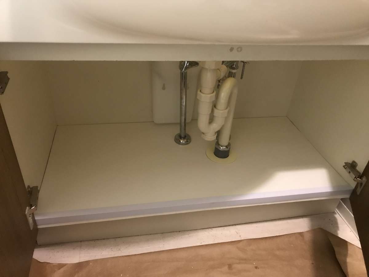 今回は、洗面化粧台下台の中、水漏れと腐食部分をメンテナンスします。 早速排水トラップ部分の交換と、腐食している部材を交換します。