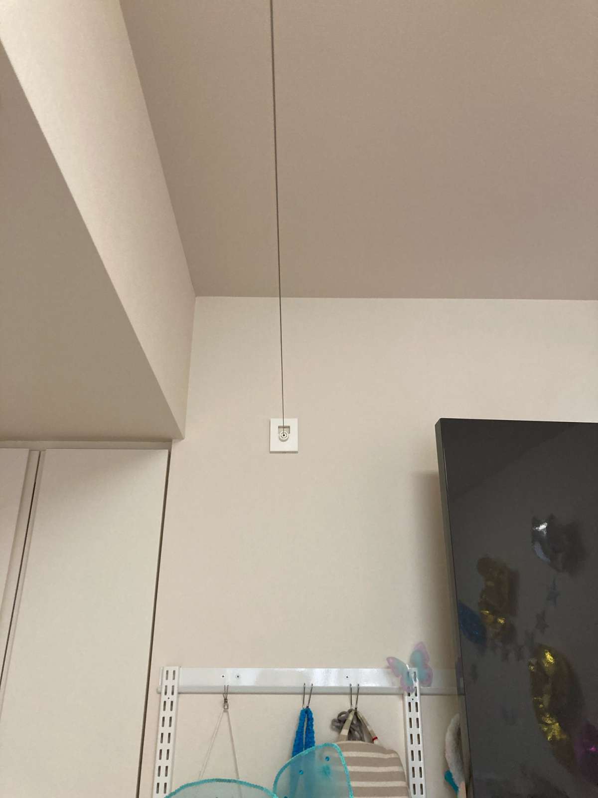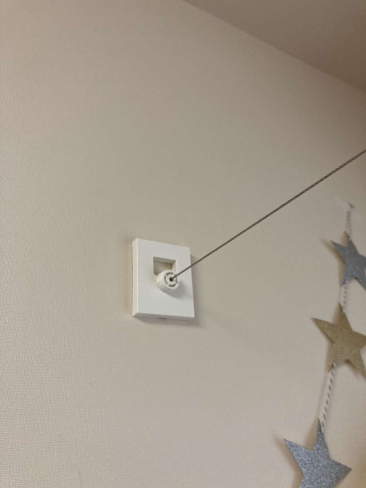 室内物干しシリーズのワイヤータイプをご紹介します。 室内物干しの場合、範囲が狭いですが、こちらのワイヤータイプは指定した壁から壁までの範囲で利用できます。 逆に途中で範囲を縮められないのがつらい所ですが・・・。