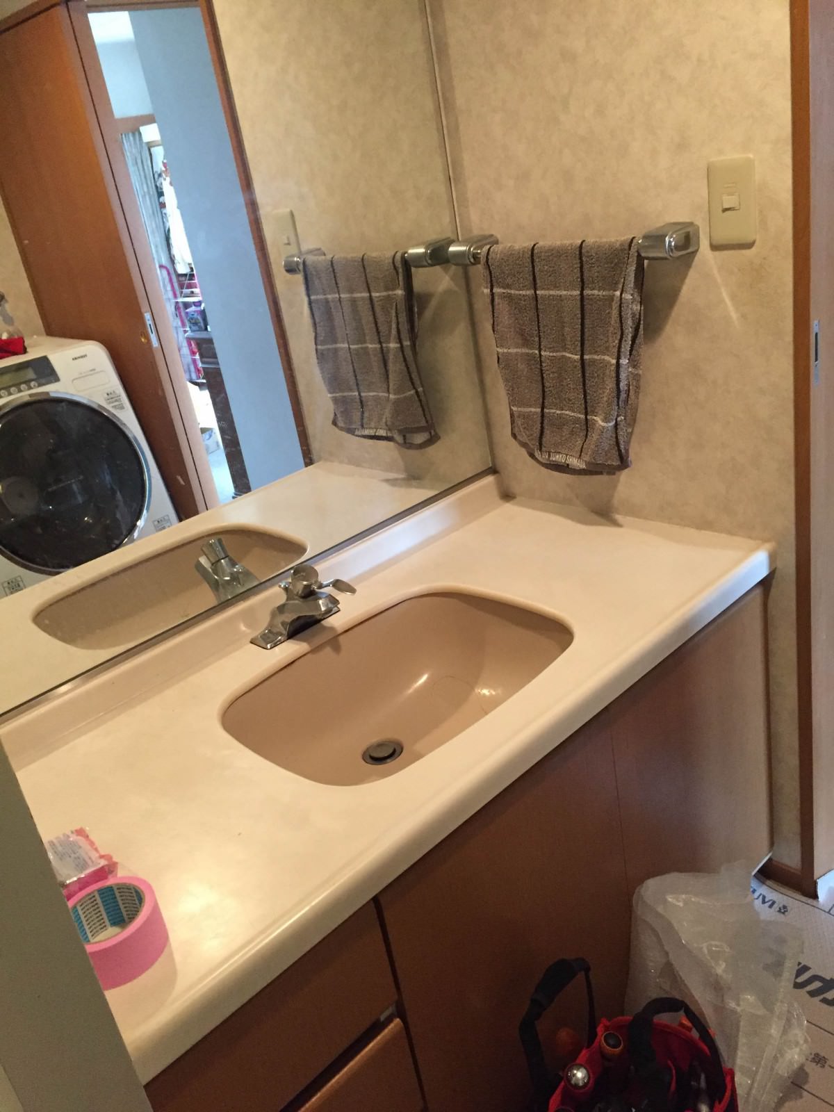 今回はとにかく「収納が少ない」、「洗面ボウルが小さい」という不便さを 解消したケースです。 写真には写っていませんが、洗面ボウル付近の台の上に 物がごちゃごちゃと置いてありました。(整髪料や歯磨き粉、歯ブラシ、髭剃りなど)