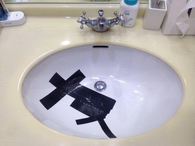 洗面台をお使いの時に、固い物を洗面ボウルに落としてしまい、 ヒビが入ってしまったとの事。 なんとかご自身でガムテープ補修して使っていらっしゃいましたが、 やはり水漏れがご不便との事で、洗面ボウルの交換を実施しました。 同時に混合水栓も古く使い勝手が悪いとの事で交換しました。