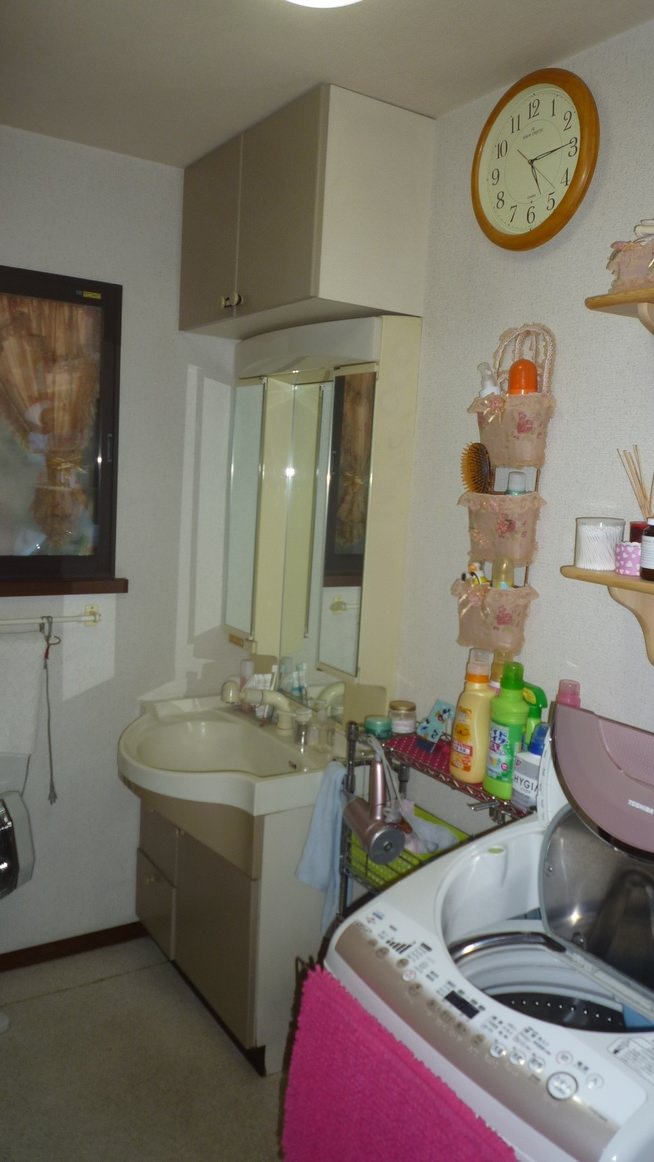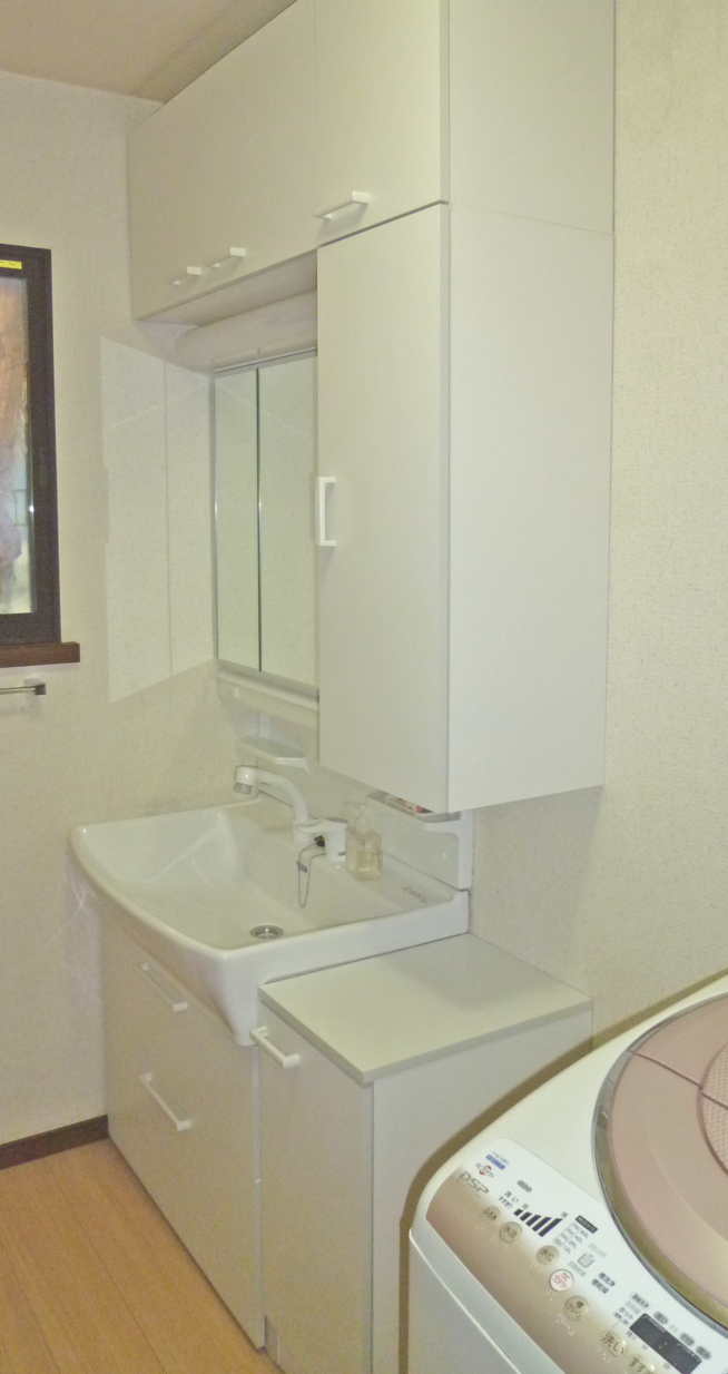 長年使ってきた洗面台は収納が少ない為、仕方なくラックや壁に収納をつくって 納めていましたが、まとまりがなく雑然としていました。 そこで、すっきりと収納したいとのご要望で、大容量の引き出し収納や 三面鏡、サイドキャビネットも設置して、収納たっぷりな洗面台に交換しました。
