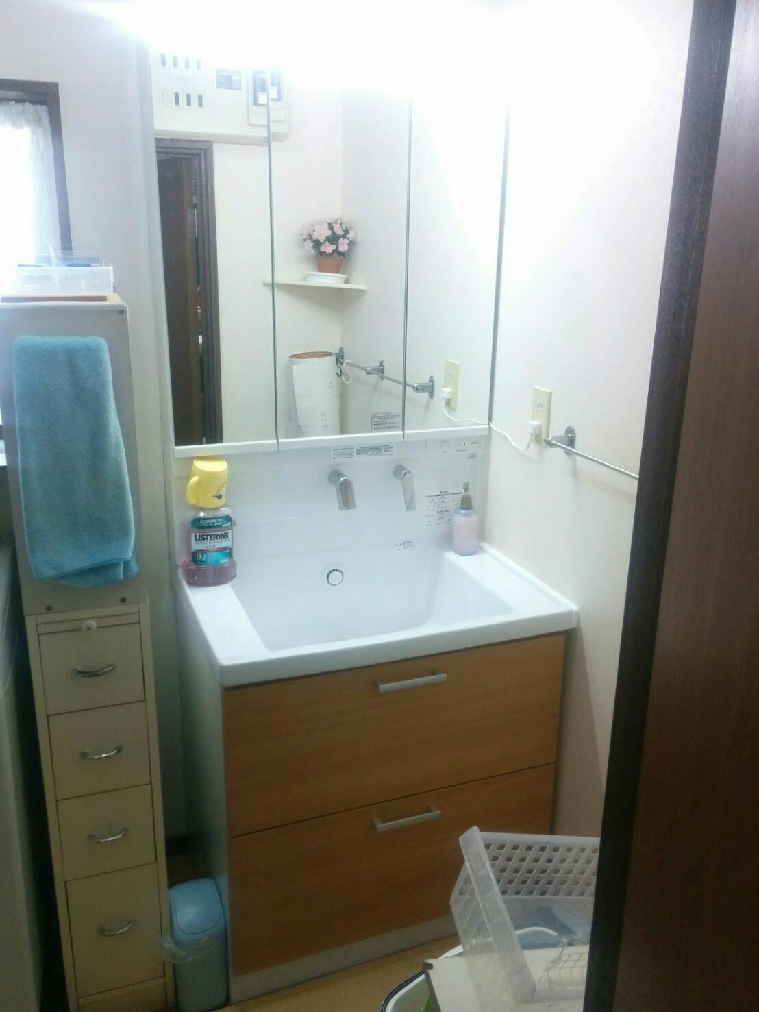 今回は、TOTOのKZシリーズ サクア スウィング3面鏡LEDエコミラー 2段引出タイプの洗面化粧台に交換する事例です。 【作業前】