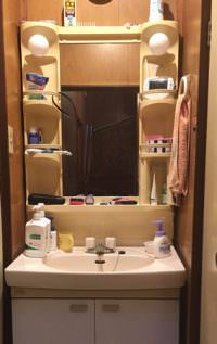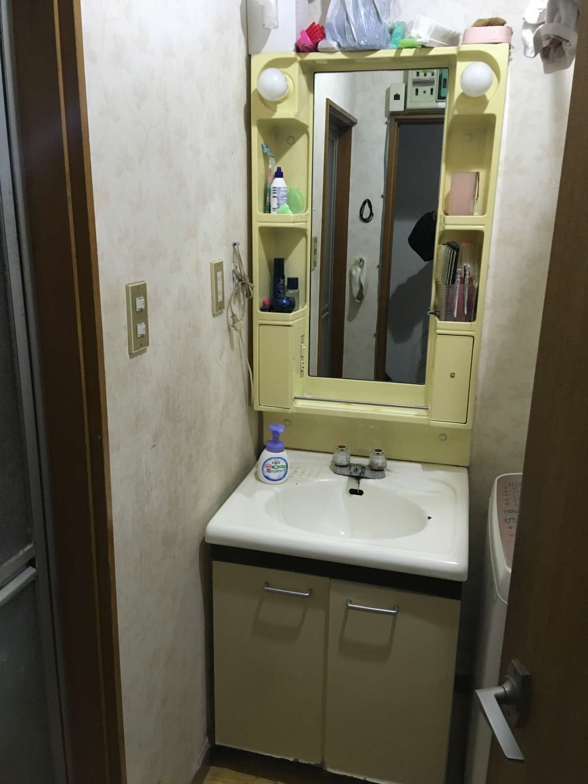 【施工前】 1面鏡2枚扉で2ハンドルタイプ水栓の洗面化粧台ですね。