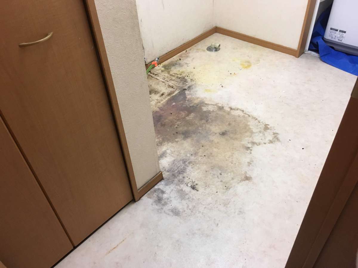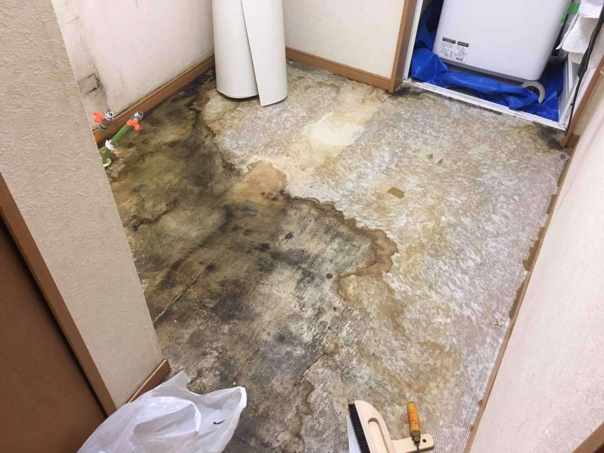 水漏れによる洗面化粧台の交換と、水漏の影響でクッションフロアがボロボロになっているため、同時に作業した実績をご紹介します。