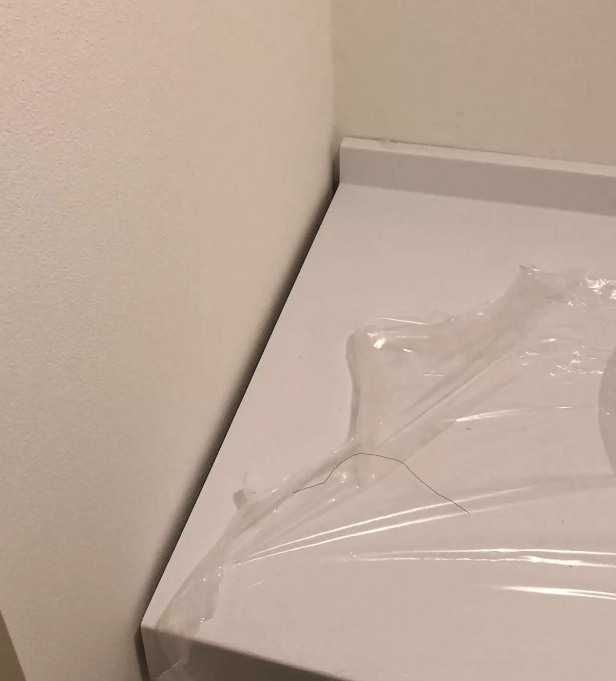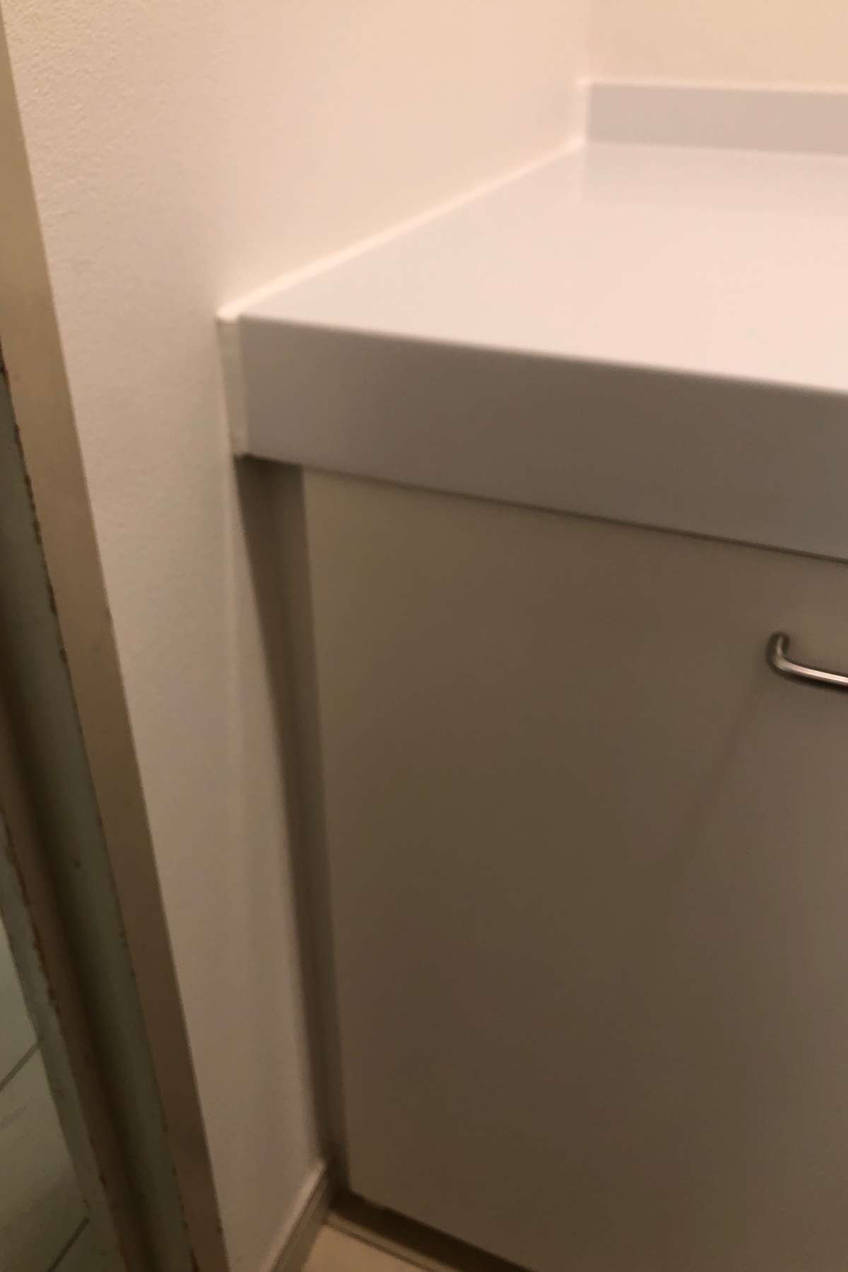 洗面所の構造上、洗面化粧台を壁際に設置するとできてしまうこの隙間を、コーキングで埋めて防水性を高めます。