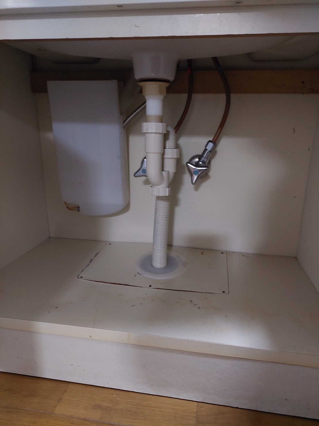 【施工後】 今回は、排水位置を調整しなければいけないため、TOTOの排水キッドを購入し調整します。 ※詳しくは、TOTOの洗面化粧台を参照ください。
