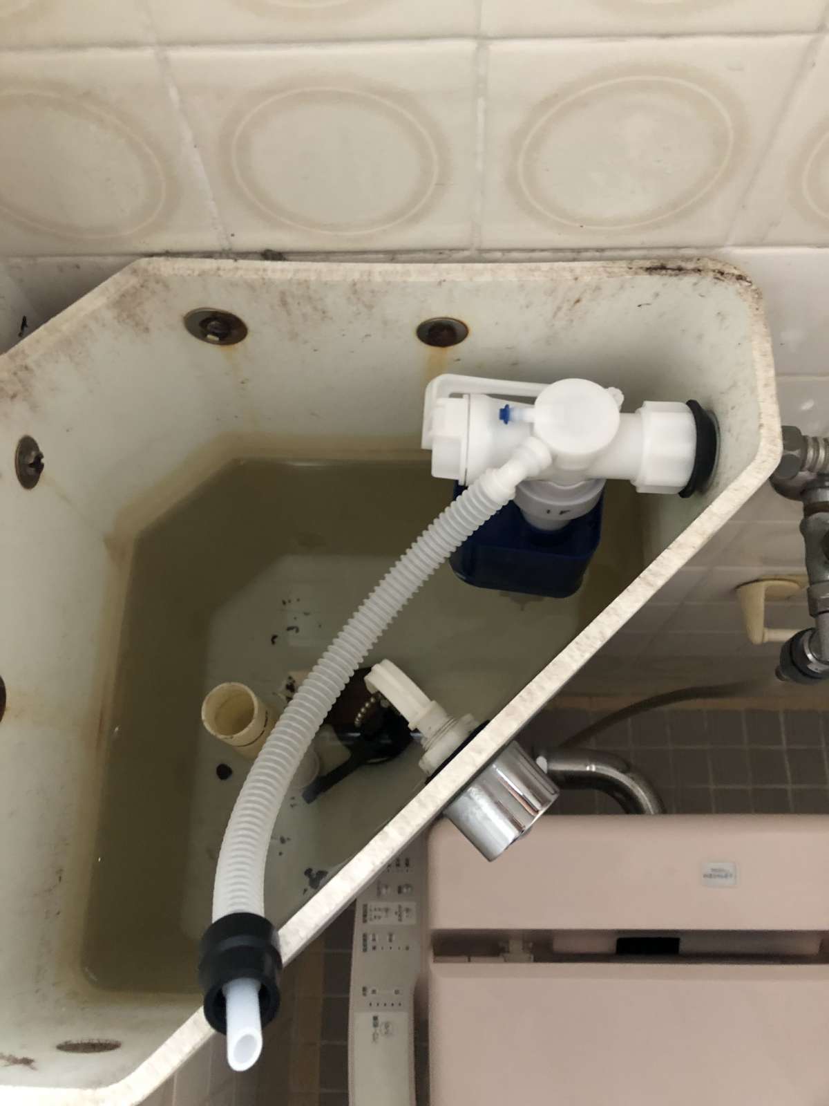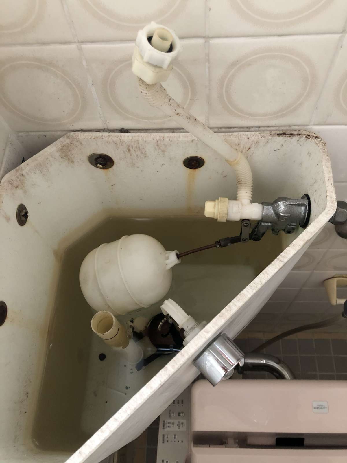 【施工前】 浮き袋部分の劣化がやはり原因で、トイレタンク内にチョロチョロ水漏れする水音が聞こえます。 もちろん、便器にも水がチョロチョロと流れている状態。 これでは水道代金が無駄に増えてしまいます。