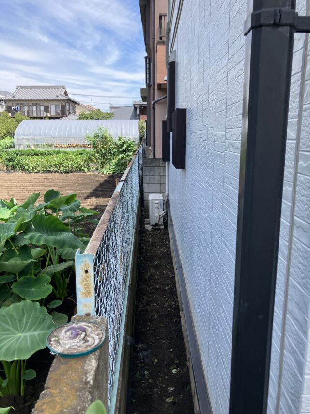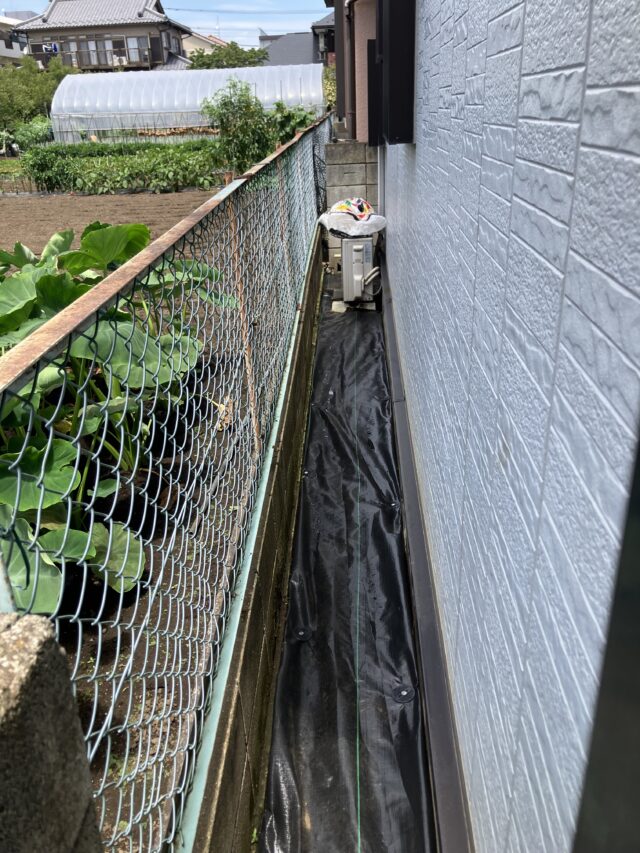 シートが敷き終わったら、砂利を敷いていきます。 軽量の防草砂利が便利で防犯にもなり、いいですね!