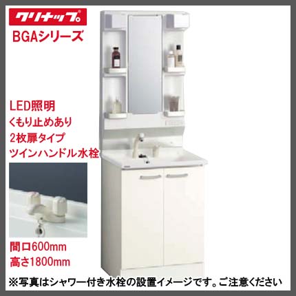 - クリナップ BGAシリーズ 600幅/高さ1800タイプ 1面鏡(くもり止めあり)LED照明 2枚扉スタンダード ツインハンドル水栓 洗面化粧台