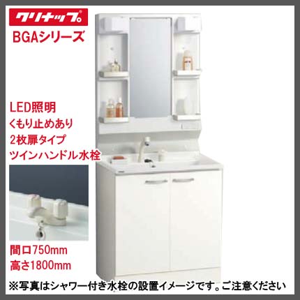 - クリナップ BGAシリーズ 750幅/高さ1800タイプ 1面鏡(くもり止めあり)LED照明 2枚扉スタンダード ツインハンドル水栓 洗面化粧台