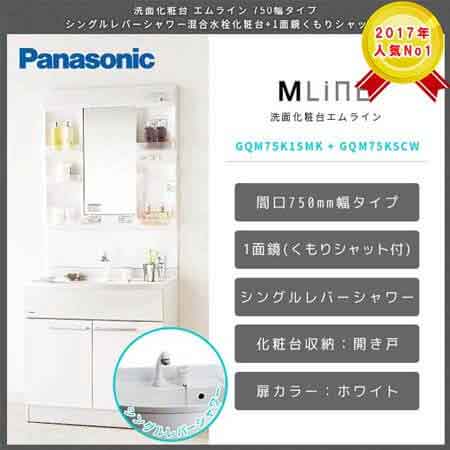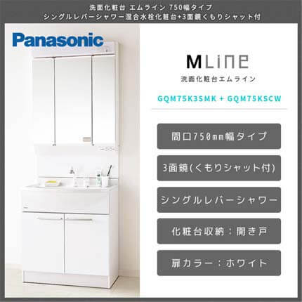 - パナソニック エムライン 750幅タイプ シングルレバーシャワー混合水栓化粧台+3面鏡くもりシャット付