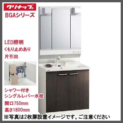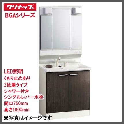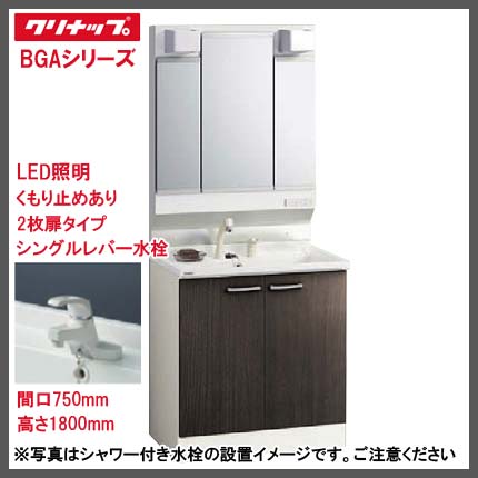 - クリナップ BGAシリーズ 750幅/高さ1800タイプ 3面鏡(くもり止めあり)LED照明 2枚扉スタンダード シャワー付シングルレバー水栓 洗面化粧台