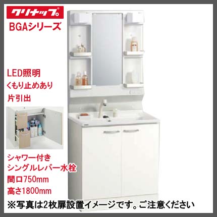 - クリナップ BGAシリーズ 750幅/高さ1800タイプ 1面鏡(くもり止めあり)LED照明 片引出スタンダード シャワー付シングルレバー水栓 洗面化粧台