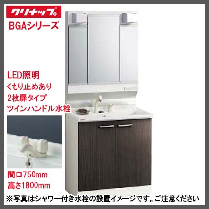 - クリナップ BGAシリーズ 750幅/高さ1800タイプ 3面鏡(くもり止めあり)LED照明 2枚扉スタンダード ツインハンドル水栓 洗面化粧台
